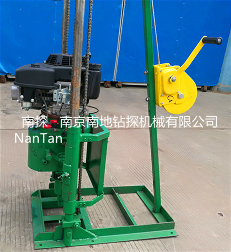 可以2人操作的取芯鉆機!鉆探深度可達30米!采用輕便的汽油機(或電動機可選)作為動力,分體式輕便實用,搬遷十分便利,帶支架穩定可靠,滿足野外車輛無法進入地區時用;鉆機操作簡單,易學易懂。可實現合金、金剛石鉆頭鉆進及麻花螺旋鉆進和不取芯三葉合金鉆頭、復合片不取芯鉆頭引孔鉆進的需求。