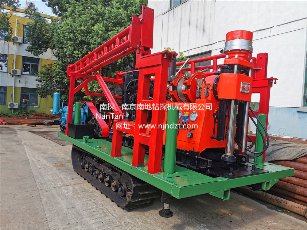 鉆機機組由履帶底盤、柴油機、升高型液壓支腿、鉆機、折疊式液壓起落鉆塔組成,共同組裝在一個機架上。鉆機可以選擇柴油機或電動機、履帶底盤及液壓支腿由獨立柴油機帶動、互不干涉。